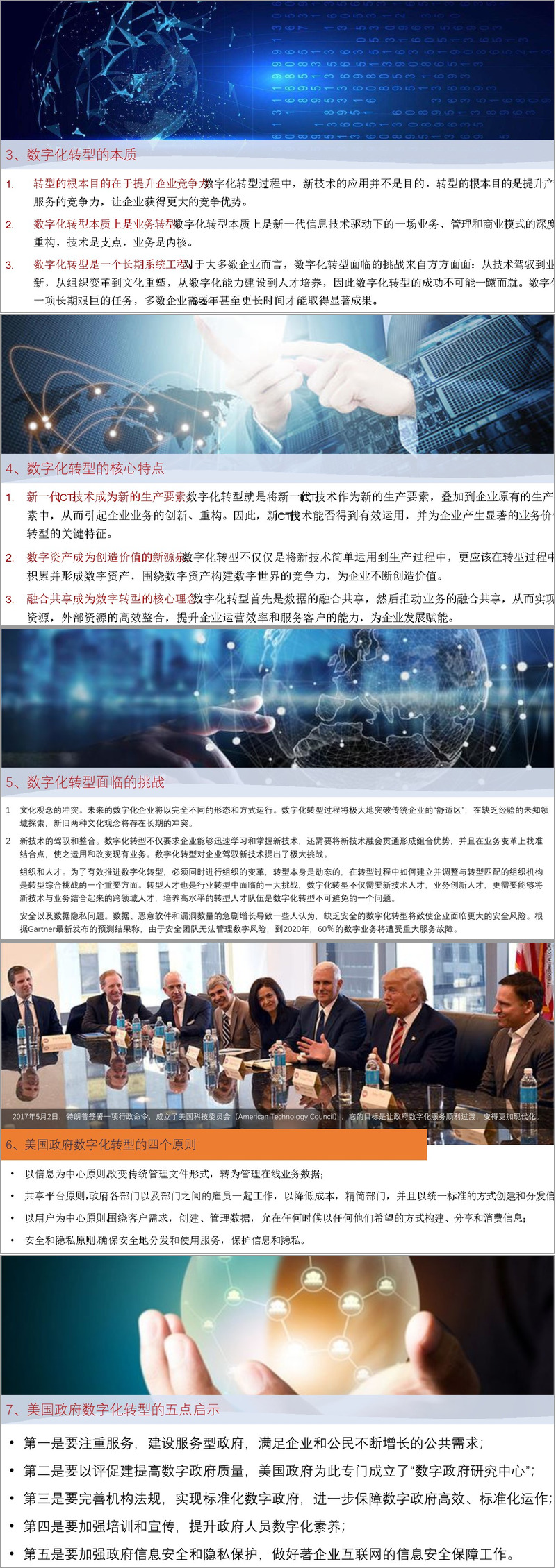 数字化转型绝非简便的技术升级,而是新一代信息技术驱动下的全方位变革。资料开篇强调,数字化时代已悄然来临:从PC时代(1990-2000)的电子邮件和浏览器,到互联网时代(2000-2010)的电子商务和社交网络,再到当前的数字化时代(2010年以来)以云计算、人工智能和区块链为标志。其定义明确指出,转型旨在利用AI、大材料、5G等科技构建新商业模式,完成开源节流、降本增效、风险控制和国际化布局,根本上提升企业竞争力。核心在于业务转型——技术是支点,业务是内核。例如,ICT技术作为新生产要素,需与企业原有要素叠加,驱动创新;数字资产成为价值源泉,通过数据融合共享整合资源;但转型也是长期系统工程,需3-5年沉淀,面临文化冲突(突破传统“舒适区”)、技术驾驭(整合新技术如AI与区块链)、组织人才(跨领域人才培养)及安全隐私(60%数字业务可能面临安全故障)等挑战。美国政府案例进一步佐证了这点:其四项原则(信息为中心、共享平台、用户为中心、安全隐私)和五点启示(如服务型政府、材料标准)强调融合共享与风险控制,值得企业借鉴。