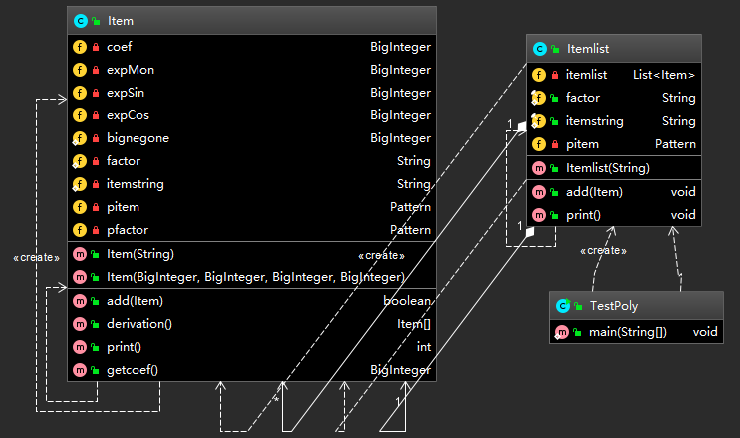 这一次作业增加了两个功能就是连乘与简单三角函数,因为三角函数仅有sin(x)和cos(x),所以所有单项式都可以化为a*x^b*sin(x)^c*cos(x)^d的标准形式,本质上与第一次标准形式相比多了2个参数,十分相似。因此此次的底层类就是单项式item,在其上的是多项式,又元素为item的链表组成。整体的功能与第一次类似,较大的区别是这一次的求导将返回3个单项式分别加入原式。