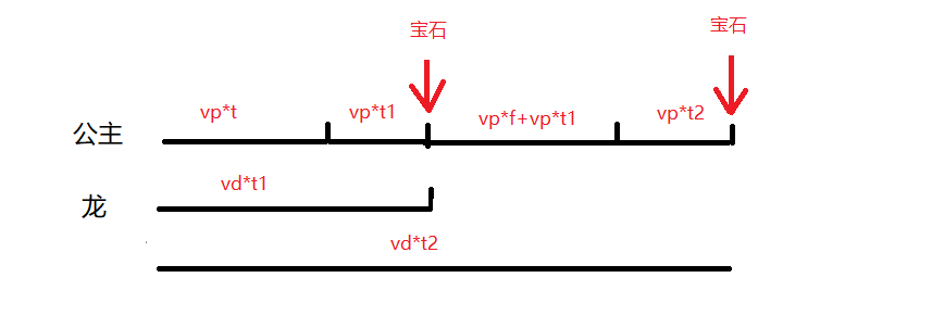 题解:当vp>=vd时,龙追不上公主;当vp<vd时,设经过t1时间追上公主,则初始状态t1=(vp*t*1.0)/(vd-vp);公主和龙的距离为ans=vd*t1,扔下宝石,龙返回洞穴花费时间t1,整理花费时间f; 再次从洞穴追上公主花费时间t2,t2=(ans+vp*f+vp*t1)/(vd-vp),ans=vd*t2;以此类推直到c>=ans