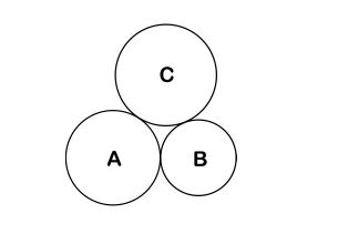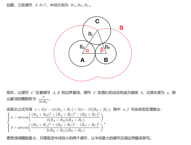 题意:任取两枚硬币固定在二维平面上,并让它们恰好相切,用第三枚硬币沿着它们形成的边界进行翻滚,即时刻保证与至少一枚已固定的硬币相切。这样这枚运动的硬币在翻滚了一定的圈数之后,一定会回到原点,即恰好绕了一周。有三种情况,AB固定C运动;AC固定B运动;BC固定A运动。