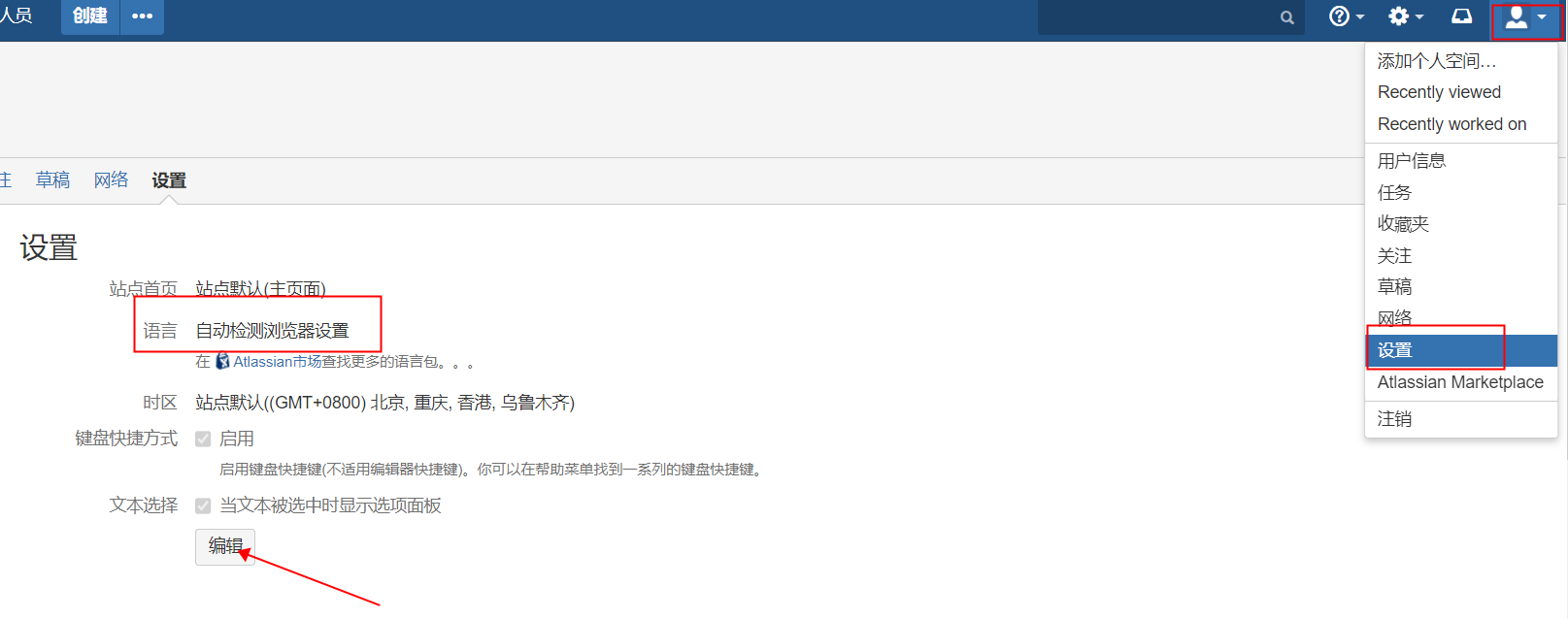 在Confluence站点中,点击右上角的 头像,然后选择 Settings