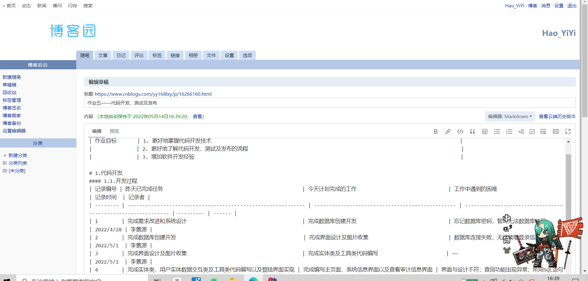 | 1 | 完成需求改进和系统设计 | 完成数据库创建开发 | 忘记数据库密码,暂时无法数据库使用 | 2022/4/28 | 李景源 |