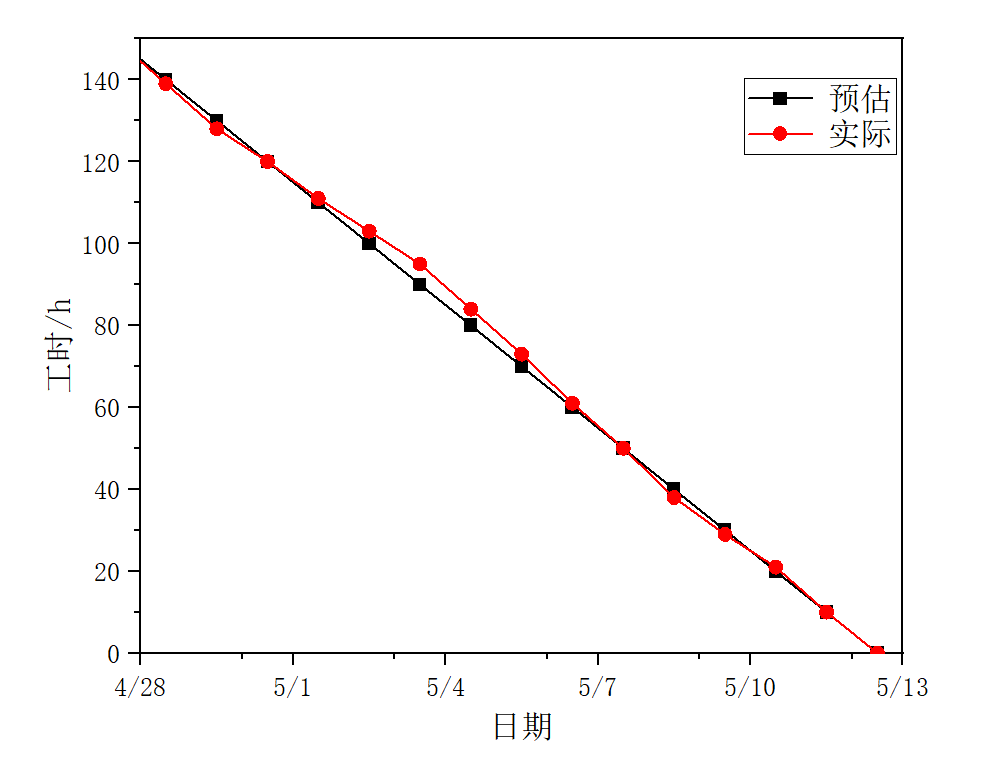 (2)虚实线含义:实线表示需要完成的预估工作的总和;虚线表示项目中需要完成的工作的总和。