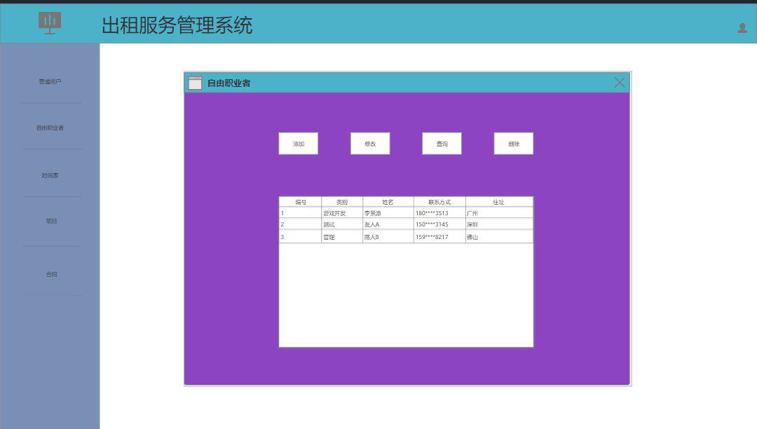 | 信息管理员 | 管理自由职业者、普通用户、时间表、项目信息、合同信息以及审计信息 | 自由职业者、普通用户、时间表、项目信息以及合同信息的增删改查功能 |