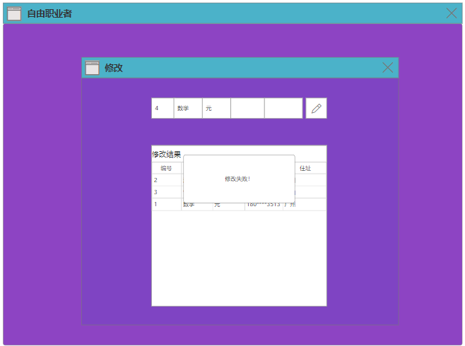 | 修复的Bug | 添加自由职业者信息保存到了数据库中的普通用户信息 | 一般 | SQL语句的表单名写错 | 已修复 |