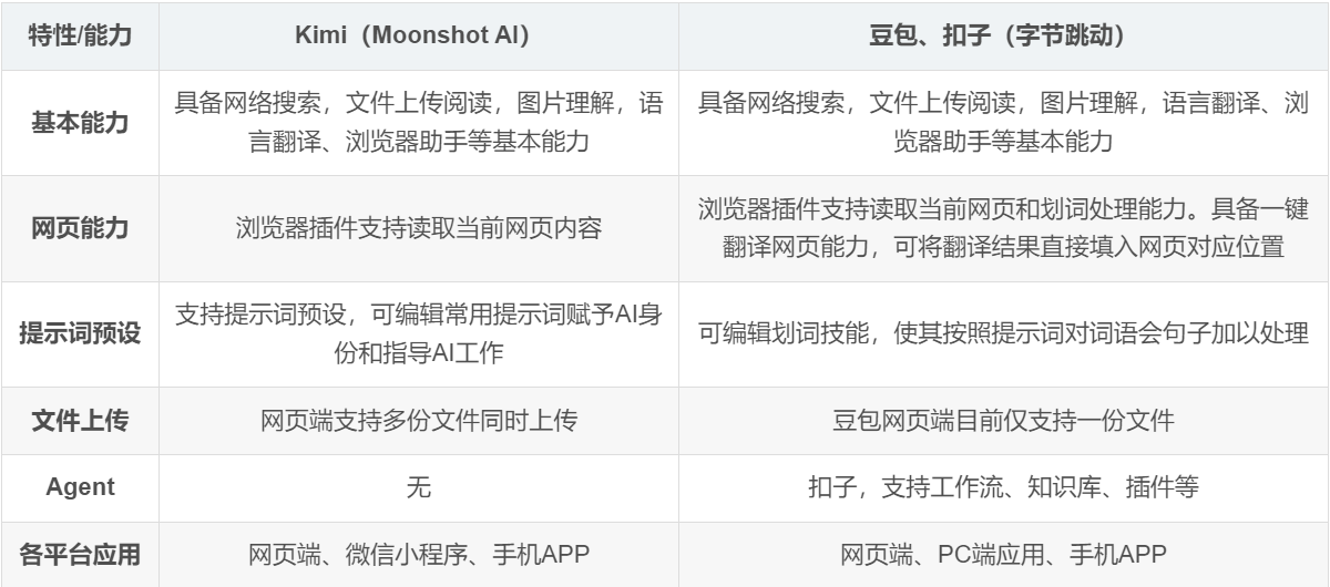 - 此表格仅对kimi和豆包在使用性上做对比,性能和参数上可官网查阅相应资料