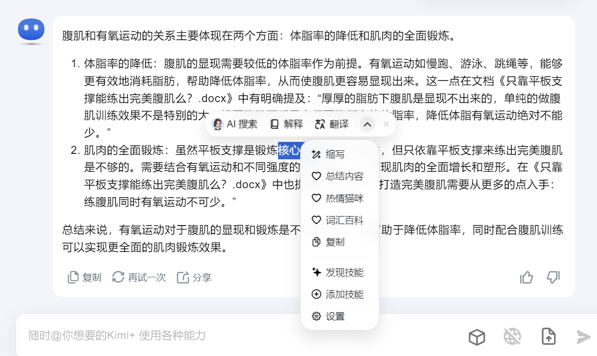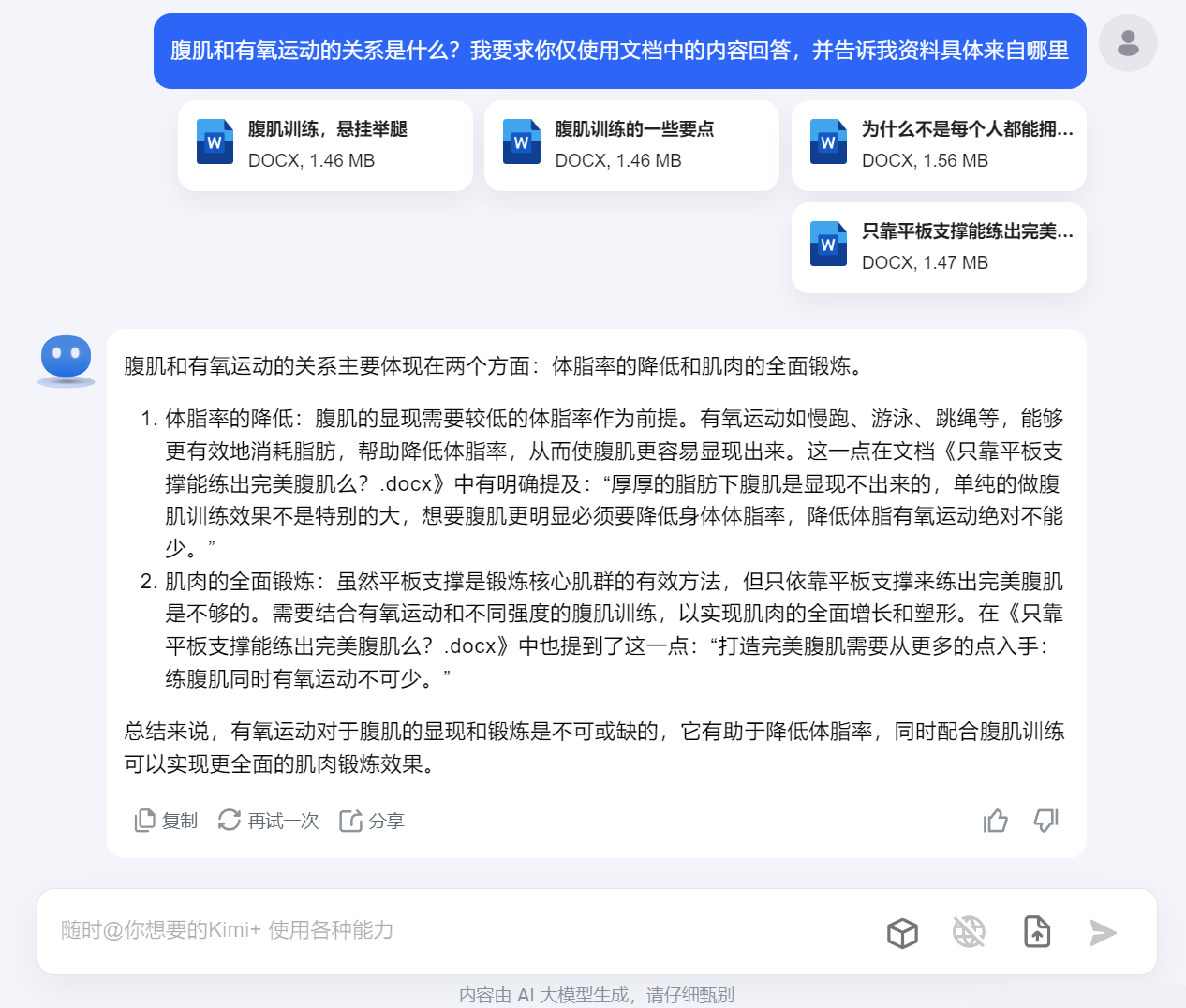 如下图,这几份文档均是锻炼有关的,我想找到我要的内容,仅需告诉AI我的需求,即可快速定位来自哪份文档,原文是如何。之后仅需要打开对应文档即可找到内容,或者直接让AI输出相关内容。