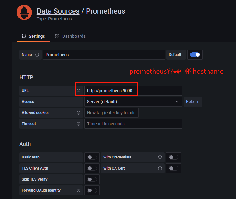在grafana页面配置data source 中,地址写为http://prometheus:9090