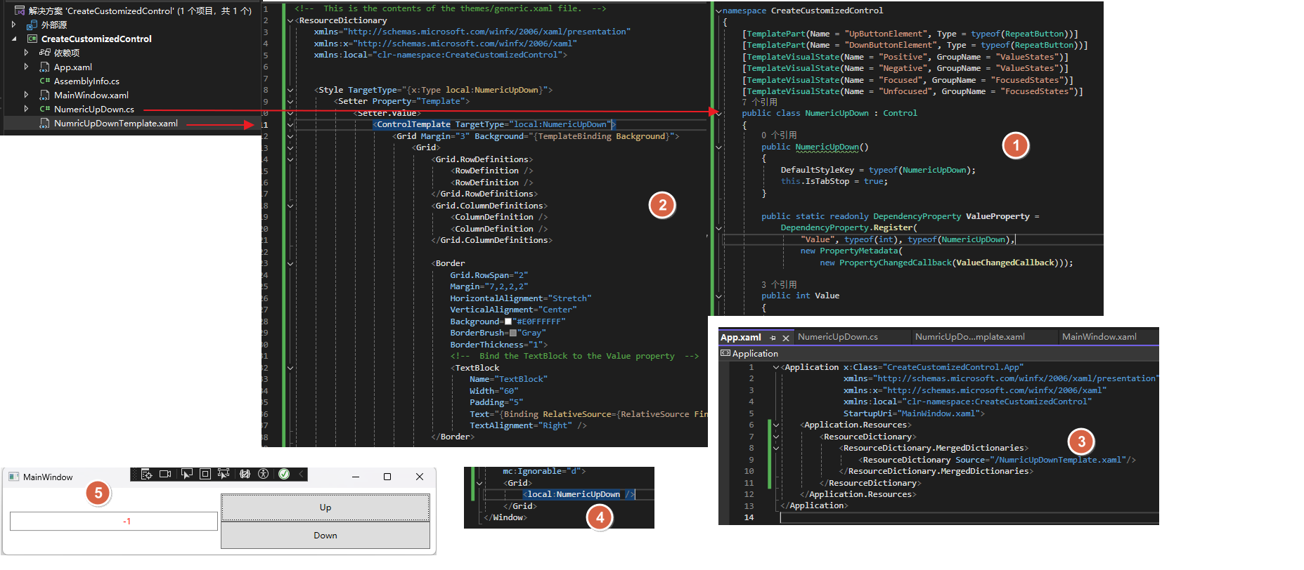 - 给这个控件去定义一个控件模板XAML(模板里面的控件元素需要定义名称A,B,C) 和RelativeSource绑定到CS里的依赖对象