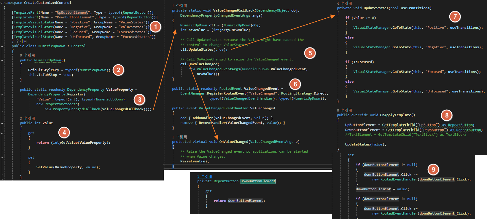 - 在CS代码里OnApplyTemplate重载函数去抓A,B,C出来 UpButtonElement = GetTemplateChild("A") as RepeatButton; 注册它的事件