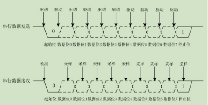 一个标准的10位异步串行通信协议(1个起始位、1个停止位和8个数据位)收发时序,如下图所示: