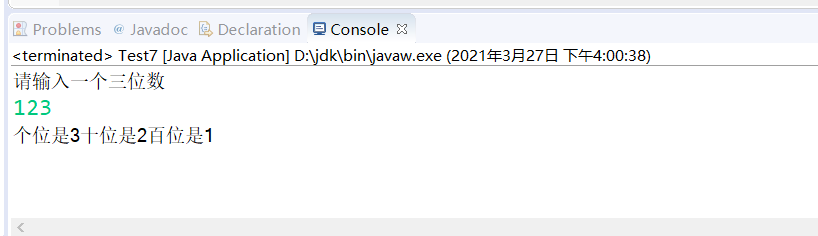 package zuoye1; import java.util.Scanner; public class Test7 { public static void main(String[] args) { // TODO Auto-generated method stub Scanner input=new Scanner(System.in); System.out.println("请输入一个三位数"); int shu=input.nextInt(); int ge=shu%10; int bai=shu/100; int shi=shu/10%10; System.out.println("个位是"+ge+"十位是"+shi+"百位是"+bai); } }