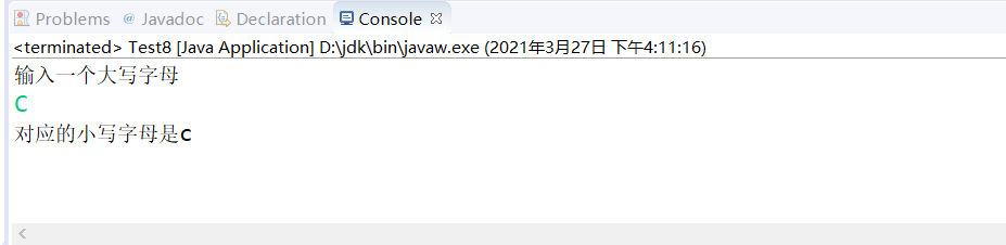 package zuoye1; import java.util.Scanner; public class Test8 { public static void main(String[] args) { // TODO Auto-generated method stub System.out.println("输入一个大写字母"); Scanner input=new Scanner(System.in); char c=input.next().charAt(0); System.out.println("对应的小写字母是"+(char)(c+32)); } }