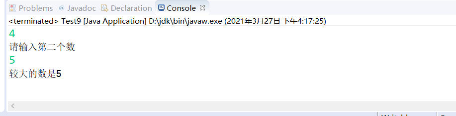 package zuoye1; import java.util.Scanner; public class Test9 { public static void main(String[] args) { // TODO Auto-generated method stub Scanner input=new Scanner(System.in); System.out.println("请输入第一个数"); int num1=input.nextInt(); System.out.println("请输入第二个数"); int num2=input.nextInt(); int max=num1>num2?num1:num2; System.out.println("较大的数是"+max); } }