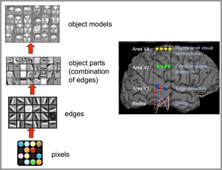 如图来说,人眼所得到的最基础的信息是各种像素,在往上会提取到各种边缘,然后是各个局部(比如眼睛,嘴巴),最后形成对整个物体的印象。