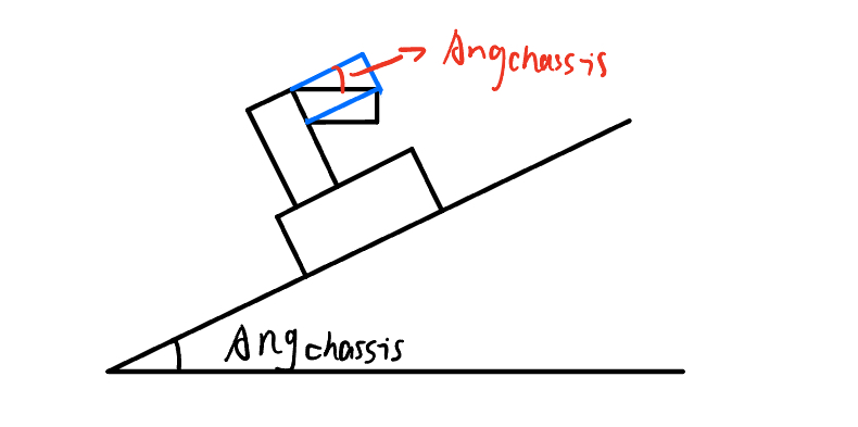 而当底盘和地面有一个夹角时,假设此时云台依旧与地面平行,即