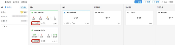 开始触发集成分支流水线,开展代码扫描和单元测试,通过流水线可以直观看到扫描结果是否成功,详细结果可以通过测试报告查看;