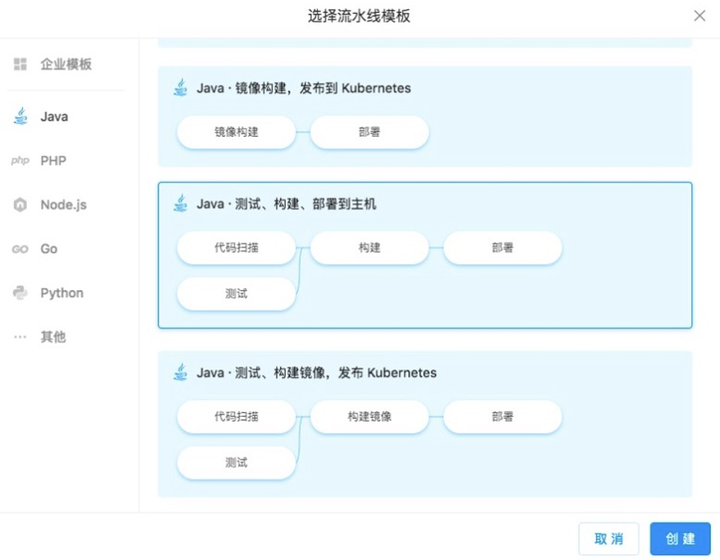 点击流水线列表右上角【新建流水线】按钮,您可以快速选择一款适合企业场景的模版;