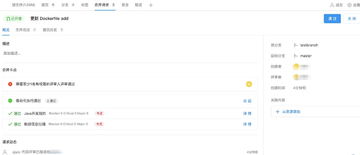 通过新建合并请求发起代码评审,强制代码评审有利于提高代码质量,帮助开发人员尽早发现问题,提高问题修复的效率;