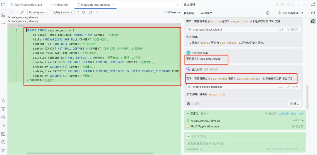 输入我们的具体需求:【帮我设计一张表 公告相关,主要包含字段:公告标题、公告内容、发布状态、发布时间、是否有效、创建时间、创建人、更新时间、更新人】,以下是具体的生成效果,为了表名统一,我继续提出需求更改了表名:【更改表名为 sys_cms_notice】。