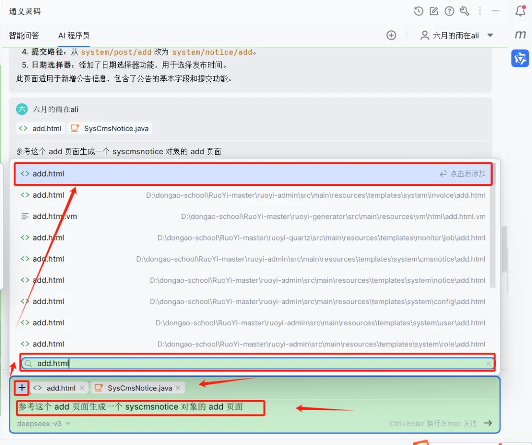 比如这里我首先生成公告管理的 add.html,那么我选择项目中原有 post 岗位 的add.html ,这里交给大家一个小窍门,可以点击选择文件的【+】,在弹出的搜索框中输入需要搜索的文件名,然后选择文件,同样的方法我在选择我们生成的公告管理的 domain 实体类,然后输入需求:【参考这个 add 页面生成一个 syscmsnotice 对象的 add 页面】。