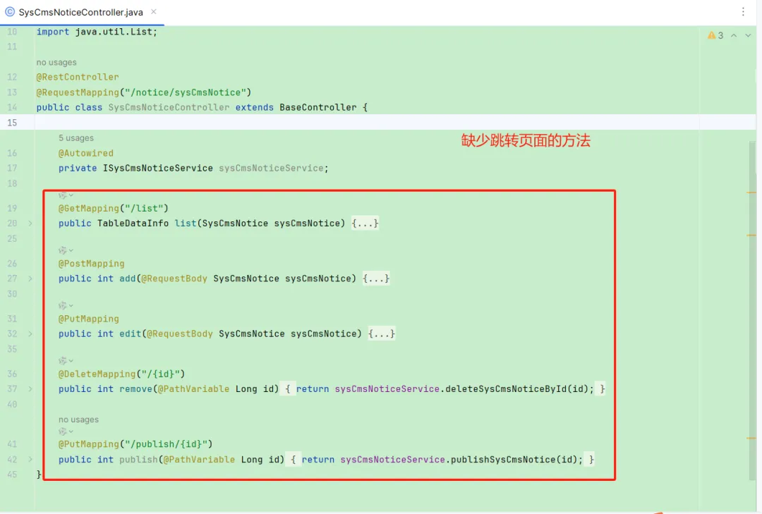 并且还触发了一个代码规范的问题【不建议将代码注释写在代码后面,而应该是换行写】,人工处理掉小问题后,对于缺失的根据 id 查询数据的方法,可以通过快捷键的方式快速补全。随后我们启动项目查看具体的页面跳转效果。