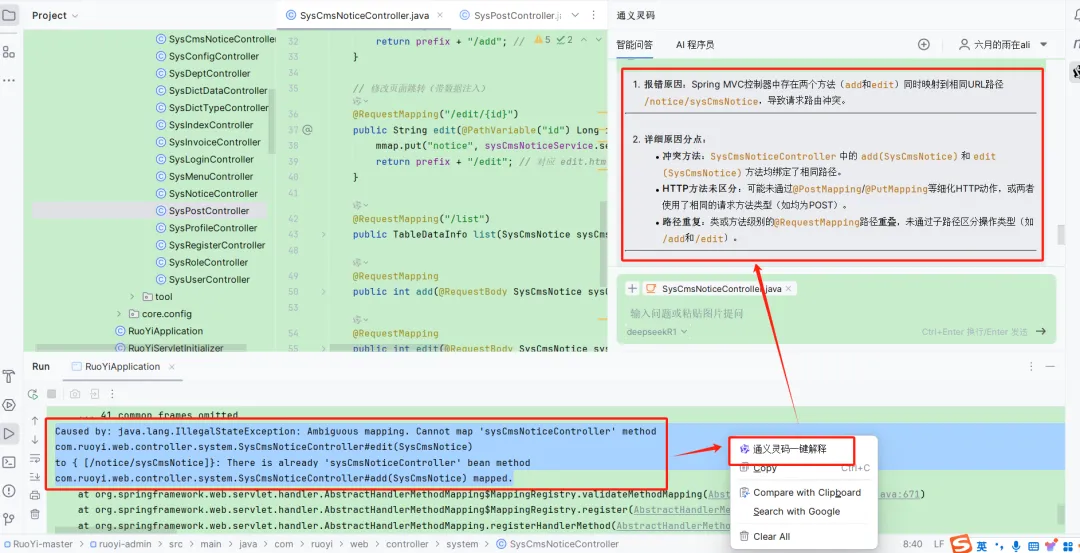 这里启动项目的时候发生了错误,那么选中具体的错误原因,右键【通义灵码一键解释】可以看到通义灵码对于当前启动异常的问题分析,我们根据分析来进行调整后就可以重新启动。