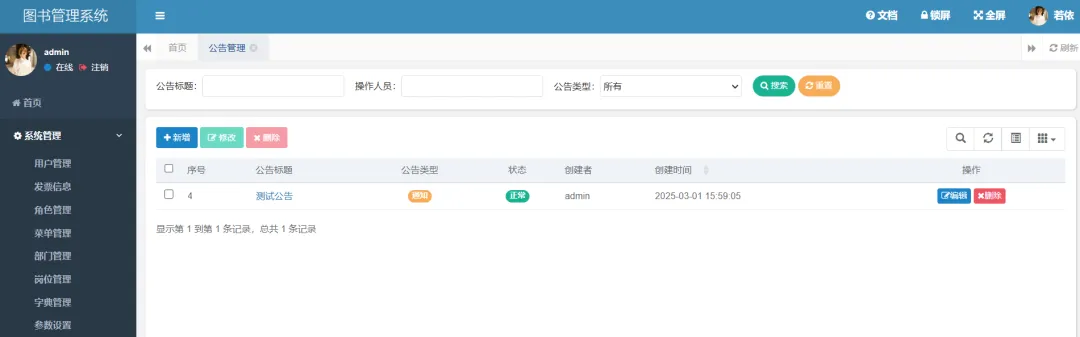其实到这里,整个公告管理的功能基本上都已经开发完了,剩下的就是配置菜单,然后进行一些功能或者页面的优化调整,后面将继续进行功能优化。