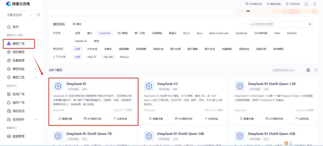 然后选择【模型广场】,这里选择 【DeepSeek】-【DeepSeek-R1】