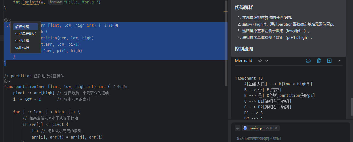 选中代码后,点击通义灵码的代码解释按钮,它会生成代码的详细解释,包括代码的作用、实现原理等。