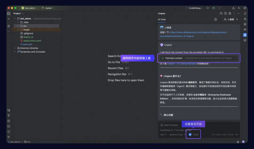 智能问答(Ask)模式支持开启工具调用能力,开启后可自主调用工程感知类工具,如工程检索、文件检索、代码检索等,无需开发者手动添加工程文件,能够自动感知工程,回答更加贴合工程场景。
