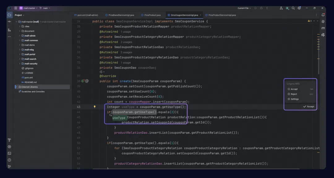新增行间建议预测(NES)功能,能够为开发者基于当前代码修改,动态预测出下一个代码修改建议,开发者只需按 Tab 键,即可高效完成代码编写。在新功能开发、存量工程维护、复杂项目迭代等场景,均能结合工程感知能力,预测当前代码文件及跨文件的修改建议,快速完成工程内的代码修改。