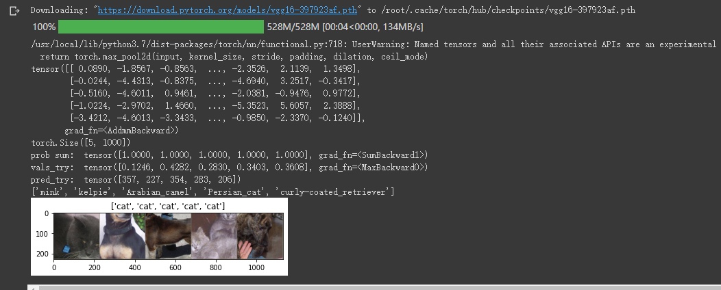 在这部分代码中,对输入的5个图片利用VGG模型进行预测,同时,使用softmax对结果进行处理,随后展示了识别结果。可以看到,识别结果是比较非常准确的。