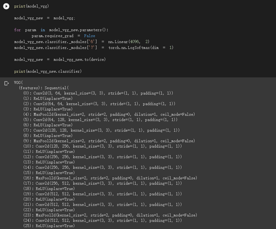 我们的目标是使用预训练好的模型,因此,需要把最后的 nn.Linear 层由1000类,替换为2类。为了在训练中冻结前面层的参数,需要设置 required_grad=False。
