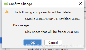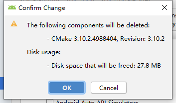 首先打开SDK Manager,然后切换到SDK Tools下,找到CMake项,记得勾选右下角的Show Package Details,展开CMake下已下载的版本,取消选择3.10.2版本,然后点击OK按钮卸载该版本