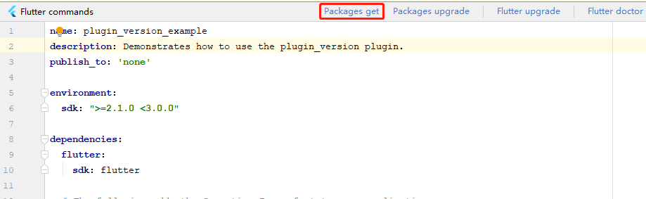 配置完对插件的引用后,点击pubspec.yaml编辑页顶部的Package get安装插件