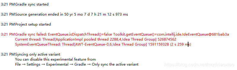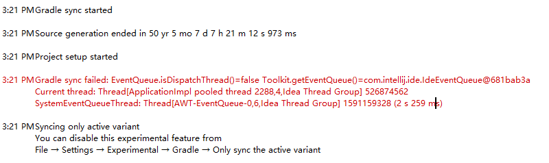 3:21 PM Gradle sync failed: EventQueue.isDispatchThread()=false Toolkit.getEventQueue()=com.intellij.ide.IdeEventQueue@681bab3a