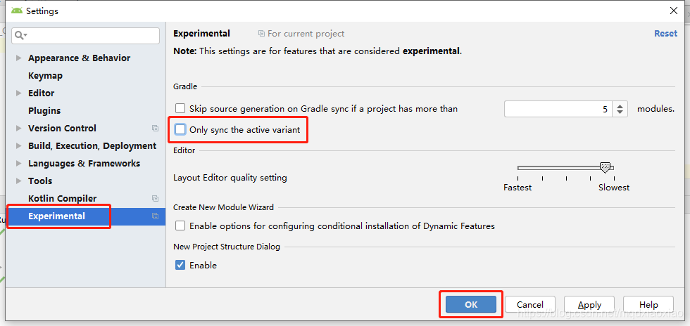 找到File → Settings → Experimental → Gradle → Only sync the active variant项,取消选择