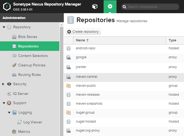Nexus搭建成功后默认已帮我们创建了两个Maven hosted仓库,分别为maven-releases和maven-snapshots,这两个其实已经够用了,为了演示,我们创建一个专门存放Android开发包的仓库,就叫做android-repo吧