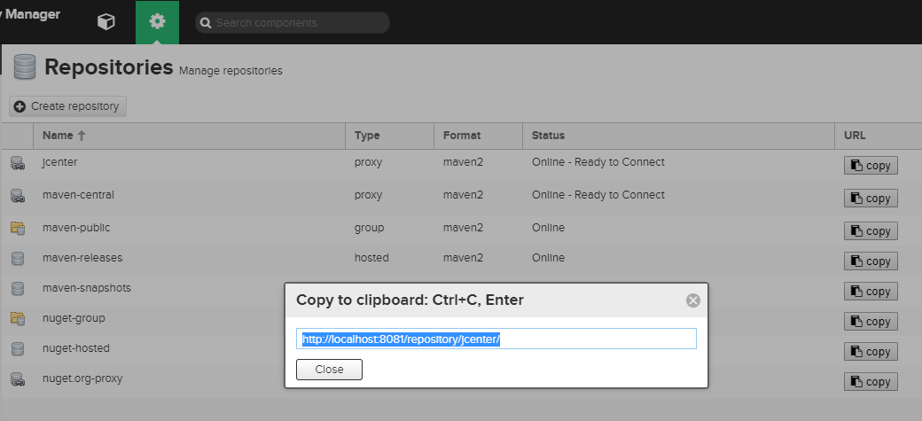 创建完成后就可以在仓库列表中看到新增了jcenter仓库,点击copy按钮即可复制该仓库的地址