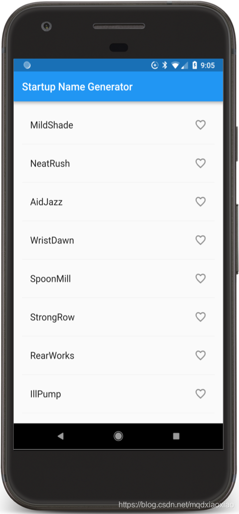 主要是修改_buildRow()方法,ListTitle的属性设置一个Icon,Icon的参数Icons.favorite_border是一个常量,这个图标是在Flutter SDK中内置的,无需再添加