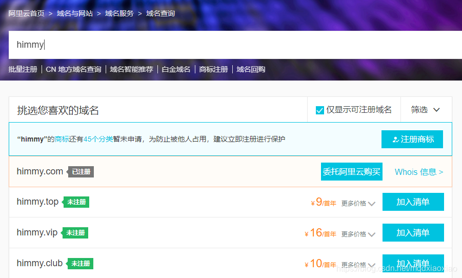 如果没被人抢注就可以加入清单直接购买