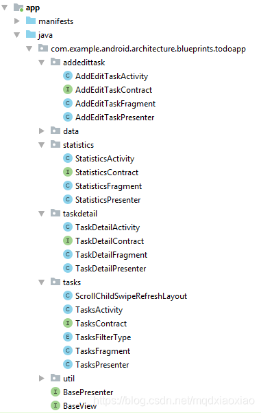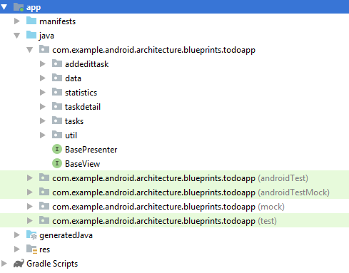 我们主要研究MVP代码的实现,androidTest、androidTestMock、mock、test下是测试的代码,不在我们本次的讨论范围内,下次会另开一篇文章讨论。