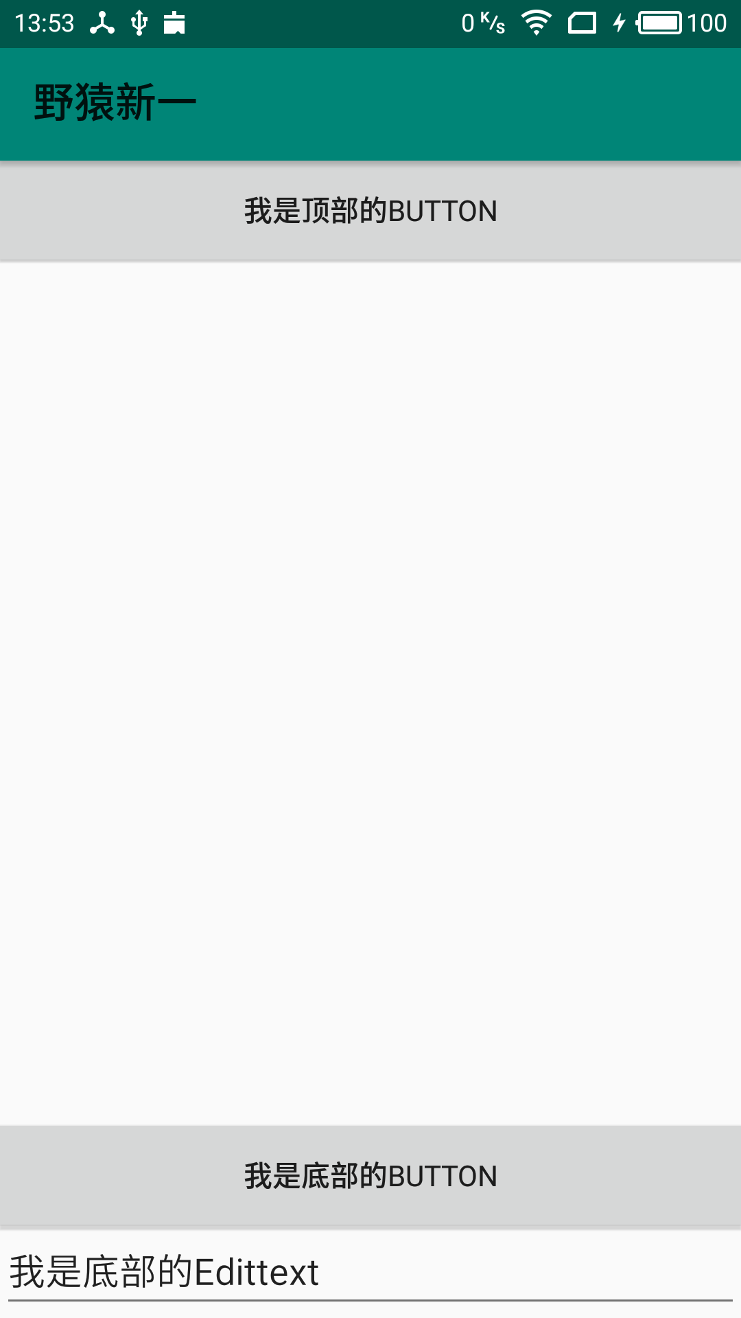 在点击底部的Edittext后弹出软键盘,软键盘把Edittext顶上去了,没有被遮挡,但是顶部的标题栏和按钮却被顶到了布局外看不见了,如下gif所示。这样的体验其实也不好,因为用户在输入的同时,有可能要操作标题栏上的ActionButton,但是此时标题已被顶出布局外,用户还要先收起软键盘,再去操作标题栏上的按钮。