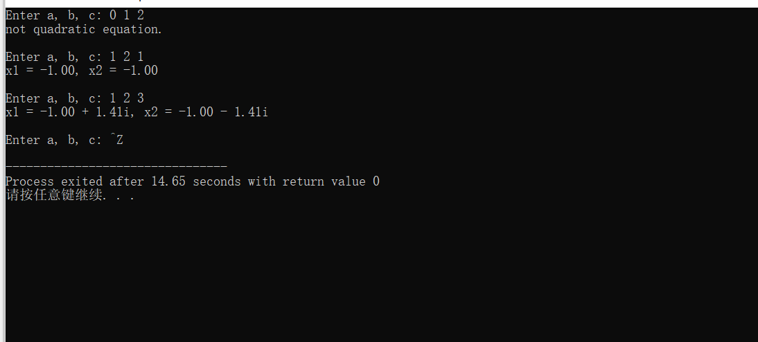 #include <math.h> #include <stdio.h> int main() { float a, b, c, x1, x2; float delta, real, imag; printf("Enter a, b, c: "); while(scanf("%f%f%f", &a, &b, &c) != EOF) { if(a == 0) printf("not quadratic equation.\n\n"); else { delta = b*b - 4*a*c; if(delta >= 0) { x1 = (-b + sqrt(delta)) / (2*a); x2 = (-b - sqrt(delta)) / (2*a); printf("x1 = %.2f, x2 = %.2f\n\n", x1, x2); } else { real = -b/(2*a); imag = sqrt(-delta) / (2*a); printf("x1 = %.2f + %.2fi, x2 = %.2f - %.2fi\n\n", real, imag, real, imag); } } printf("Enter a, b, c: "); } return 0; }