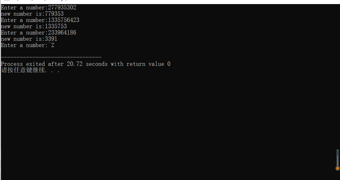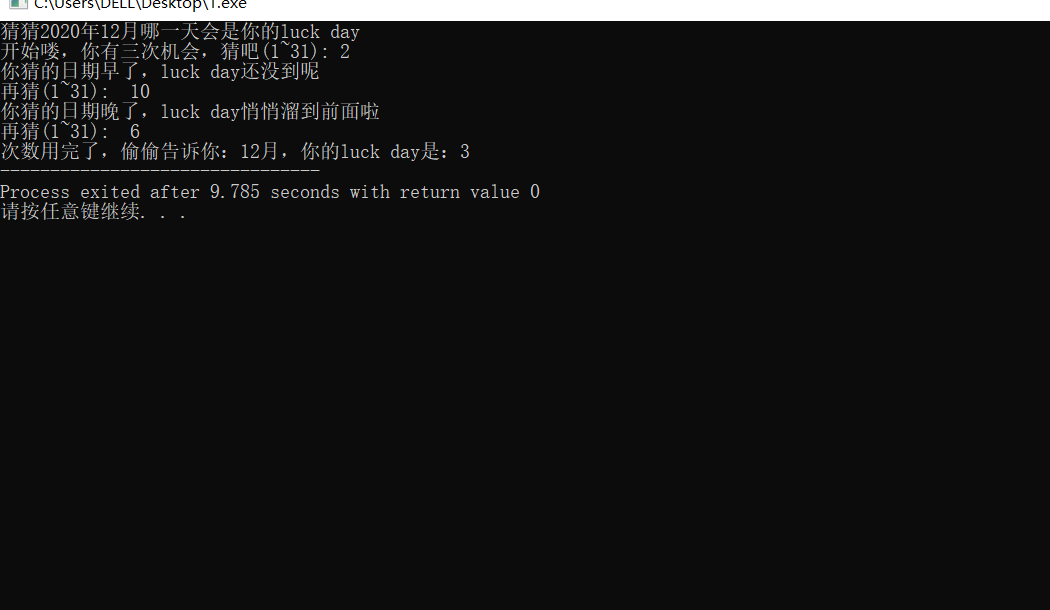 #include<stdio.h> #include<stdlib.h> #include<time.h> int main() { int a,x,y=1; srand(time(0)); x=rand()%31+1; printf("猜猜2020年12月哪一天会是你的luck day\n"); printf("开始喽,你有三次机会,猜吧(1~31): "); scanf("%d",&a); while(y<3) { if(a==x) { printf("你猜的日期是正确的!\n"); break; } else if(a>x) printf("你猜的日期晚了,luck day悄悄溜到前面啦\n"); else printf("你猜的日期早了,luck day还没到呢\n"); printf("再猜(1~31): "); scanf("%d",&a); y++; } if (y>=3) printf("次数用完了,偷偷告诉你:12月,你的luck day是:%d",x); return 0; }