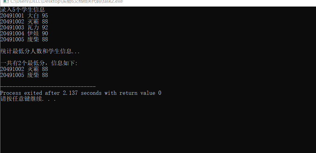 #include <stdio.h> const int N=5; // 定义结构体类型struct student,并定义STU为其别名 typedef struct student { long no; char name[20]; int score; }STU; // 函数声明 void input(STU s[], int n); int findMinlist(STU s[], STU t[], int n); void output(STU s[], int n); int main() { STU stu[N], minlist[N]; int count; printf("录入%d个学生信息\n", N); input(stu, N); printf("\n统计最低分人数和学生信息...\n"); count = findMinlist(stu, minlist, N); printf("\n一共有%d个最低分,信息如下:\n", count); output(minlist, count); return 0; } // 输入n个学生信息,存放在结构体数组s中 void input(STU s[], int n) { int i; for(i=0; i<n; i++) scanf("%ld %s %d", &s[i].no, s[i].name, &s[i].score); } // 输出结构体s中n个元素信息 void output(STU s[], int n) { int i; for(i=0; i<n; i++) printf("%ld %s %d\n", s[i].no, s[i].name, s[i].score); } // 在结构体数组s中,查找最低分学生的记录,将其存入结构体数组t中 // 形参n是结构体数组s中元素个数 // 函数返回最低分的学生人数 int findMinlist(STU s[], STU t[], int n) { // 补足函数实现 int i,min,k=0; min=s[0].score; for(i=0;i<n;i++) if(s[i].score<min) min=s[i].score; for(i=0;i<n;i++) if(s[i].score==min) t[k++]=s[i]; return k; }