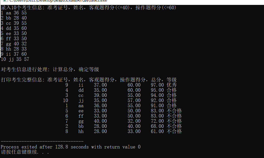 #include <stdio.h> #include <string.h> const int N = 10; // 定义结构体类型struct student,并定义其别名为STU typedef struct student { long int id; char name[20]; float objective; /*客观题得分*/ float subjective; /*操作题得分*/ float sum; char level[10]; }STU; // 函数声明 void input(STU s[], int n); void output(STU s[], int n); void process(STU s[], int n); int main() { STU stu[N]; printf("录入%d个考生信息: 准考证号,姓名,客观题得分(<=40),操作题得分(<=60)\n", N); input(stu, N); printf("\n对考生信息进行处理: 计算总分,确定等级\n"); process(stu, N); printf("\n打印考生完整信息: 准考证号,姓名,客观题得分,操作题得分,总分,等级\n"); output(stu, N); return 0; } // 录入考生信息:准考证号,姓名,客观题得分,操作题得分 void input(STU s[], int n) { // 补足代码 int i; for(i=0;i<n;i++) scanf("%ld %s %f %f",&s[i].id,s[i].name,&s[i].objective,&s[i].subjective); } //输出考生完整信息: 准考证号,姓名,客观题得分,操作题得分,总分,等级 void output(STU s[], int n) { // 补足代码 int i; for (i=0; i<n; i++) { printf("%26ld %5s %8.2f %12.2f %8.2f %s\n",s[i].id,s[i].name,s[i].objective,s[i].subjective,s[i].sum,s[i].level); } } // 对考生信息进行处理:计算总分,排序,确定等级 void process(STU s[], int n) { // 补足代码 int i,j; STU temp; for(i=0;i<n;i++) { s[i].sum=s[i].objective+s[i].subjective; if(s[i].sum>95) strcpy(s[i].level,"优秀"); else if(s[i].sum>90) strcpy(s[i].level,"合格"); else strcpy(s[i].level,"不合格"); } for(i=0;i<n-1;i++) for(j=0;j<n-1-i;j++) if(s[j].sum<s[j+1].sum) { temp=s[j]; s[j]=s[j+1]; s[j+1]=temp; } }
