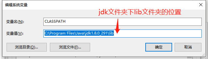4、再次点击系统变量的新建按钮,变量名CLASSPATH,变量值为jdk文件夹下lib文件夹的路径,点击确定