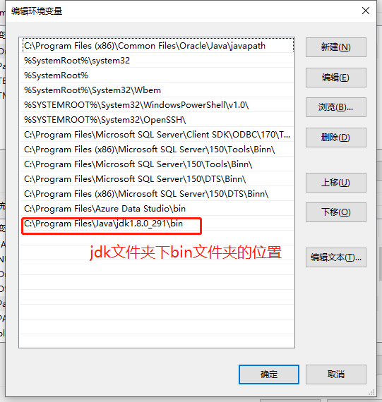 5、双击系统变量的PATH变量、点击新建按钮,变量值为jdk文件夹下bin文件夹的路径,点击确定按钮,然后其他界面都确定保存即可